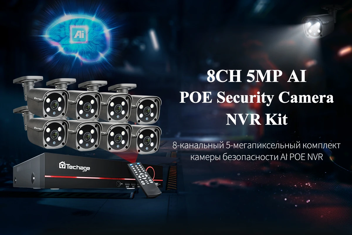 1. Noul nostru sistem de camere POE de 5MP. Design NVR cu 8 canale, suportă conectarea a până la 8 camere. Puteți achiziționa camere IP POE Techage pentru a vă extinde sistemul CCTV.